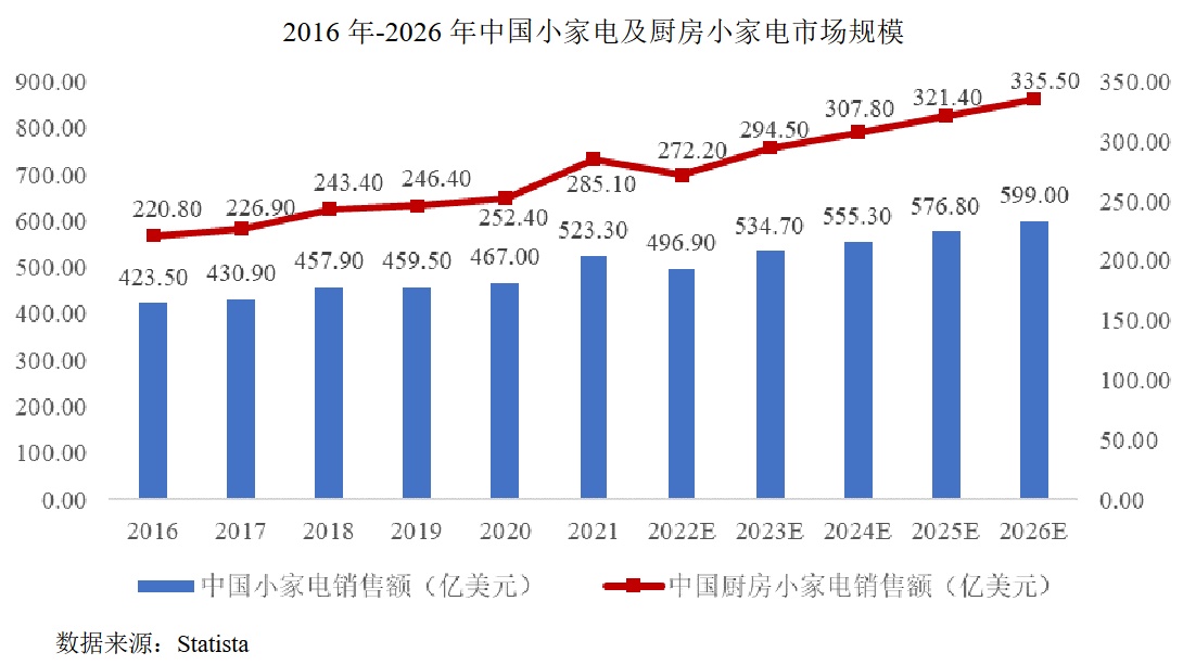 我国已成为全球小家电产品的重要消费市场,根据Statista发布数据显示,2016年至2021年,我国小家电市场规模由423.50亿美元增长至523.30亿美元,预计2026年我国小家电市场规模将进一步达到599.00亿美元。同时,我国厨房小家电市场亦实现良好增长,在应用场景不断重构、家电升级及智能化等趋势下,能够满足消费者多样烹饪需求、提升消费者体验的厨房小家电市场需求旺盛,2021年我国厨房小家电市场规模已达到285.10亿美元,预计至2026年我国厨房小家电市场将进一步增长至335.50亿美元。
