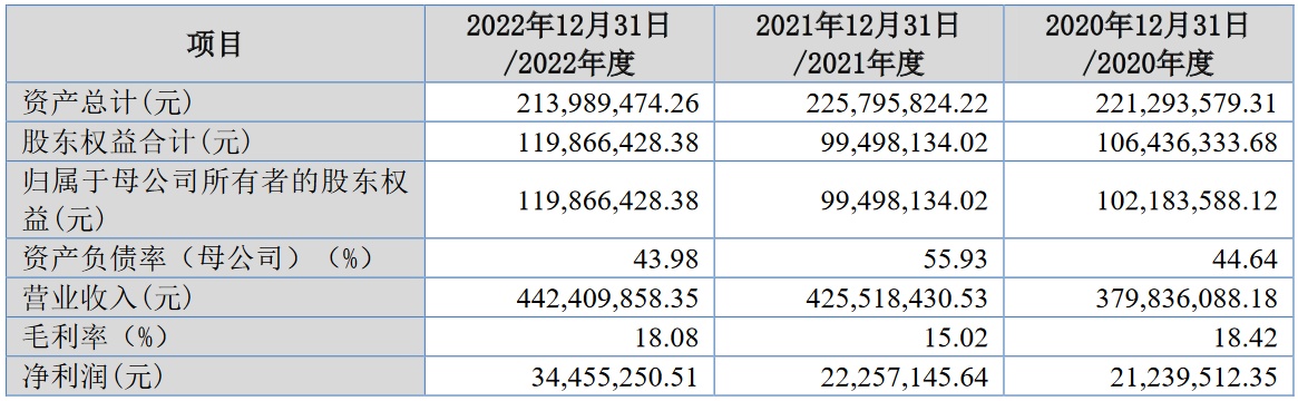 财务方面,于2020年度、2021年度及2022年度,公司实现营业收入分别约为3.80亿元、4.26亿元、4.42亿元。公司净利润分别约为2123.95万元、2225.71万元、3444.55万元人民币。