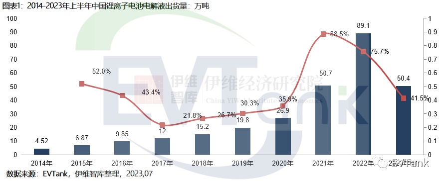 智通财经APP获悉,近日,研究机构EVTank联合伊维经济研究院更新了年初发布的《中国锂离子电池电解液行业发展白皮书(2023年)》。更新后的白皮书统计数据显示,2023年上半年中国锂离子电池电解液出货量为50.4万吨,市场规模为241.9亿元,EVTank预计2023年全年中国电解液出货量将达到116.9万吨。企业方面,中国电解液行业CR10由2022年的88.3%提升至2023年上半年的90.3%。