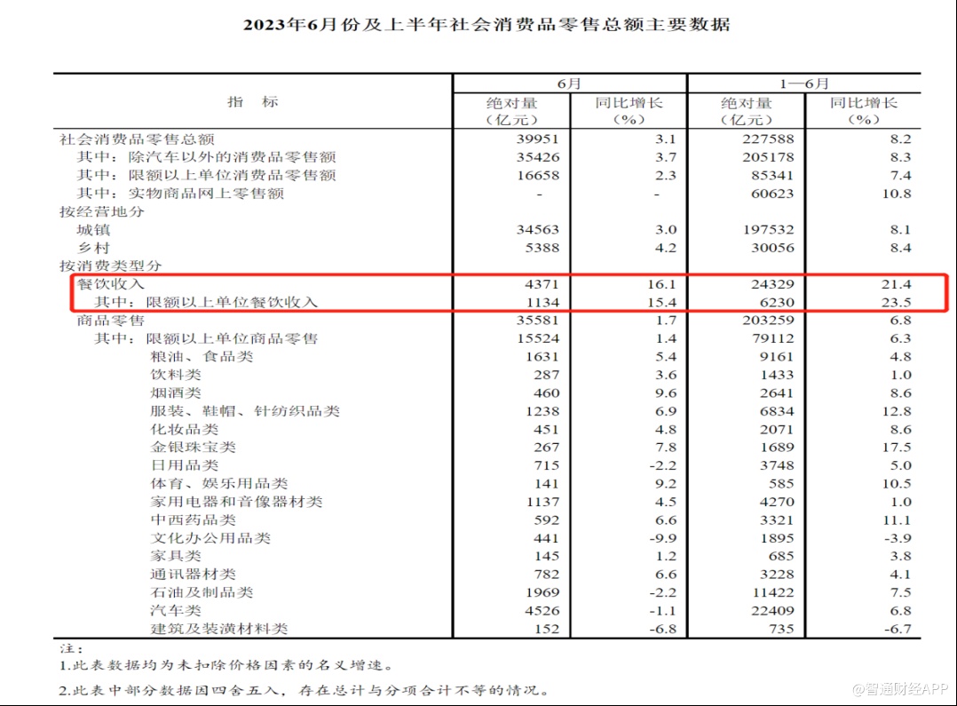 国家统计局数据显示,2023年上半年,餐饮行业收入达到2.43万亿元,同比增长21.4%,其中,限额以上单位餐饮收入达到6230亿元(人民币,下同),同比增长23.5%。总体而言,餐饮消费复苏势头明显,但分月看增速呈先扬后抑的走势。今年4-6月,餐饮行业收入分别为3751亿元、4070亿元和4371亿元,同比增速分别为43.8%、35.1%和16.1%。