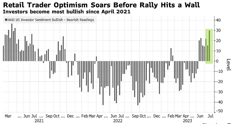 智通财经APP获悉,周四之前,美股散户交易员的乐观情绪飙升至27个月来的最高水平。美国个人投资者协会调查(AAII)显示,备受关注的牛熊价差连续第七周为正值,截至7月19日当周升至29.9。这是自2021年4月以来最乐观的情绪,高于前一个时期的15.1。Vanda Securities汇编的数据显示,近几周,日内交易员涌入大型科技股和基准交易所交易基金(ETF),在过去五个交易日向股市注入了逾72亿美元资金。