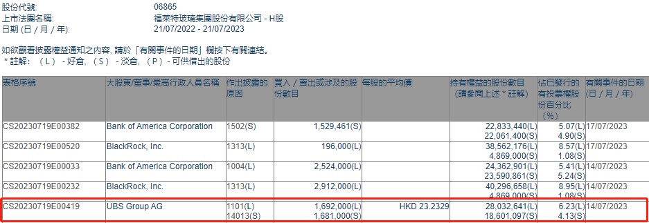 智通财经APP获悉,香港联交所最新资料显示,7月14日,UBS Group AG增持福莱特玻璃(06865)169.2万股,每股作价23.2329港元,总金额约为3931.01万港元。增持后最新持股数目约为2803.26万股,最新持股比例为6.23%。