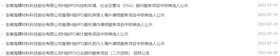 智通财经APP获悉,安徽海螺材料科技股份有限公司(简称:海螺材料科技)拟香港H股IPO上市。根据安徽招标投标信息网显示,公司此前就香港H股IPO中介团队进行招标,目前境内律师、发行人境外律师、保荐人境外律师、审计师、内控及ESG顾问等已进入中标候选人公示阶段,尚未见保荐人的招标信息。