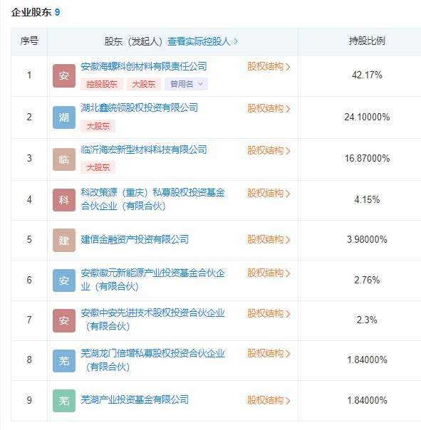 天眼查数据显示,海螺材料科技大股东为安徽海螺科创材料有限责任公司,持股约42.17%。今年初时,公司增资扩股项目在安徽省产权交易中心顺利成交,6家投资方,总计认购新增股本7336万元,募集资金总额超2.02亿元。6家投资方总计认购新增股本7336万元,募集资金总额超2.02亿元。据天眼查数据,投资者包括双百基金、建信投资、国元直投、中安泰信、洪泰基金、远大创投等。