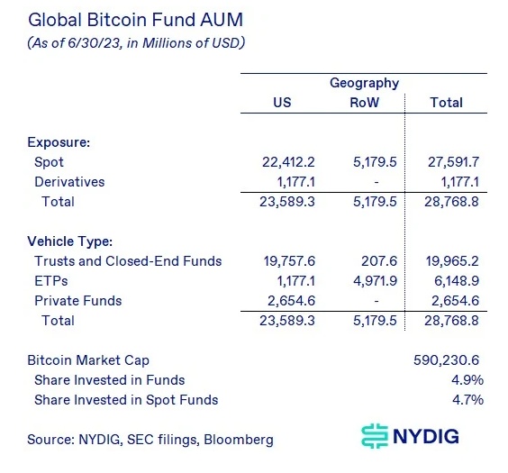 NYDIG称,其已经建立了一个模型,模型显示,目前现有投资产品的管理资产约为288亿美元,其中包括276亿美元的现货类产品。
