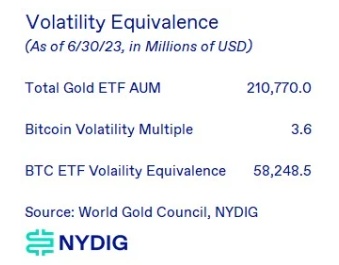 NYDIG写道:“比特币的波动性大约是黄金的3.6倍,这意味着在波动性相当的基础上,投资者需要比黄金(以美元为基础)少3.6倍的比特币才能获得同样多的风险敞口。尽管如此,这将导致比特币ETF的需求增加近300亿美元。”