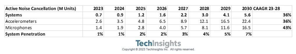 除了每个系统使用四个加速度计外,TechInsights估计,麦克风的需求将从2023年的每个系统2.1个增加到2030年的每个系统3.0个。这意味着主动降噪系统的麦克风需求将从2023年的140万增加到2030年的1650万。