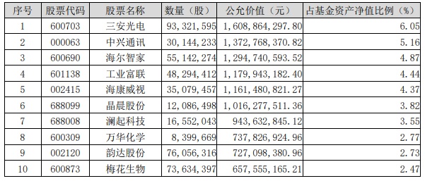 截至二季度末,前十大重仓股分别为三安光电(600703.SH)、中兴通讯(000063.SZ)、海尔智家(600690.SH)、工业富联(601138.SH)、海康威视(002415.SZ)、晶晨股份(688099.SH)、澜起科技(688008.SH)、万华化学(600309.SH)、韵达股份(002120.SZ)、梅花生物(600873.SH)。