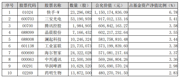 截至二季度末,前十大重仓股分别为快手-W(01024)、三安光电(600703.SH)、腾讯控股(00700)、晶晨股份(688099.SH)、澜起科技(688008.SH)、工业富联(601138.SH)、海尔智家(600690.SH)、中兴通讯(000063.SZ)、华润啤酒(00291)、药明生物(02269)。