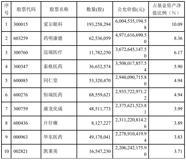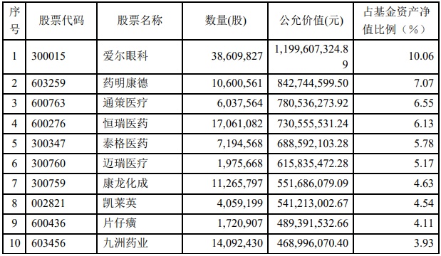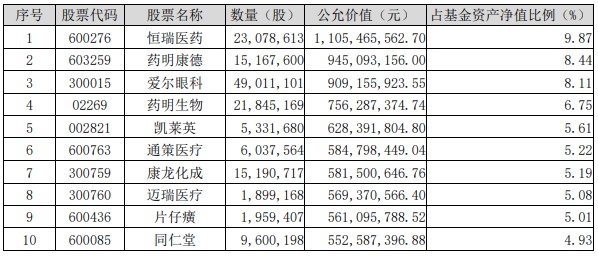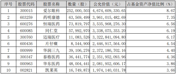 从持仓方面来看,前十大重仓股占基金资产净值的比例为55.76%。前十大重仓股依次分别为:爱尔眼科、药明康德、恒瑞医药、同仁堂、迈瑞医疗、片仔癀、华润三九、泰格医药、华东医药、凯莱英。