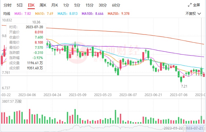 尽管特步国际延续了Q1的快速增长势头,但资本市场对此表现似乎并不买账。7月20日甫一开盘,特步国际股价高开低走,截至当天收盘报7.6港元,跌幅扩大到3.92%。拉长时间线来看,目前特步国际年内累计跌幅已经超过10%,显著跑输港股三大指数。