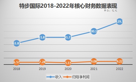 作为国内运动品牌里的“优等生”,拉长时间来看特步国际的成长性一直较强。回溯历史,2018-2022年特步国际的收入分别为63.83亿元(人民币,单位下同)、81.83亿元、81.72亿元、100.13亿元、129.3亿元,净利润6.57亿元、7.28亿元、5.13亿元、9.08亿元、9.22亿元,整体保持较为强劲的上升势头。