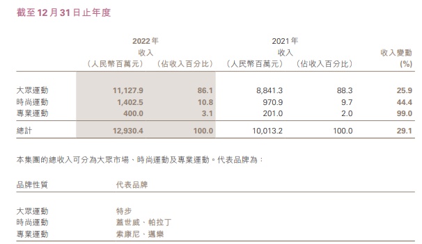 以2022年的成绩来看,特步国际暂未偏离目标路线。根据公司年报,2022年特步主品牌实现收入111.28亿元,同比增加25.9%,占总收入的86.1%;时尚运动实现收入14.03亿元,同比增加44.4%,占比10.8%;专业运动实现收入4亿元,同比增长99%,占比3.1%。