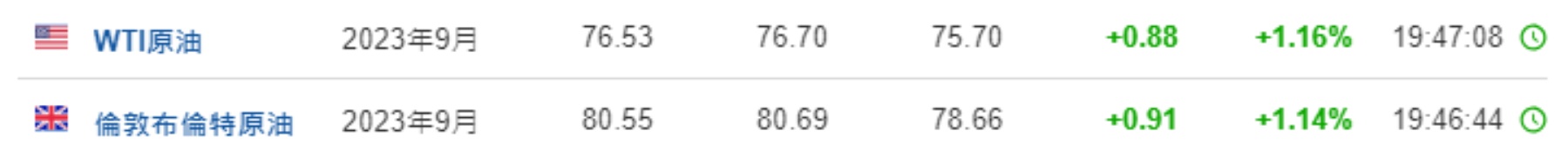 3. 截至发稿,WTI原油涨1.16%,报76.53美元/桶。布伦特原油涨1.14%,报80.55美元/桶。