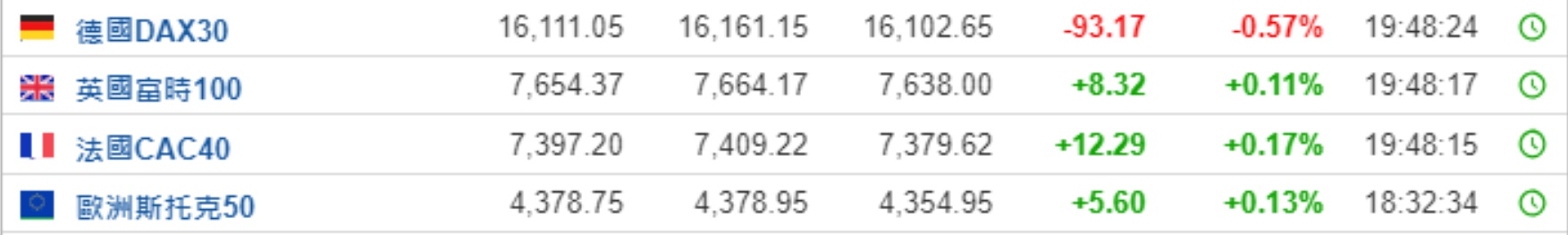 2. 截至发稿,德国DAX指数跌0.57%,英国富时100指数涨0.11%,法国CAC40指数涨0.15%,欧洲斯托克50指数涨0.11%。