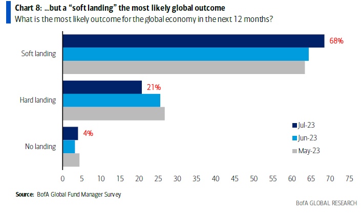 美国银行(Bank of America Corp.)7月全球调查显示,越来越多投资者押注全球经济软着陆。该调查在截至7月13日的一周内进行,结果显示,大约68%的受访基金经理预计经济将放缓,但预计不会出现衰退,而基金经理的企业利润预期目前是2022年2月以来最不悲观的预期。
