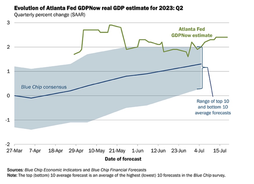 更广泛的劳动力市场方面,6月非农数据报告对下决心打压薪资增速以持续压低通胀的美联储来说并不算“满意”。6月美国非农就业人口超过20万人,失业率、劳动参与率保持稳定,工资略有上升,均显示劳动力市场仍然紧俏且相对健康,意味着众多空缺的工作岗位以及强劲的薪资仍然能够支撑美国消费支出,进而预示着美国经济“软着陆”希望越来越大。