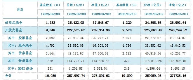 智通财经APP获悉,7月21日,中基协发布6月公募基金市场数据。截至2023年6月底,我国境内共有基金管理公司144家,其中,外商投资基金管理公司48家(包括中外合资和外商独资),内资基金管理公司96家;取得公募基金管理资格的证券公司或证券公司资产管理子公司12家、保险资产管理公司1家。以上机构管理的公募基金资产净值合计27.69万亿元。