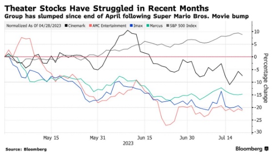 今年年初,影院股的上涨在一定程度上受到了4月份上映的《超级马里奥兄弟大电影》大获成功的推动,但随着夏季电影淡季的到来,这股上涨势头有所降温。上周末,《碟中谍7:致命清算(上)》的首映未能达到预期,进一步加剧了人们对该行业的担忧。自5月初以来,喜满客影城、AMC院线(AMC.US)、IMAX Corp.(IMAX.US)和马库斯(MCS.US)的股价表现均落后于标普500指数。