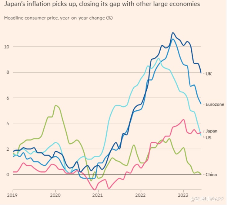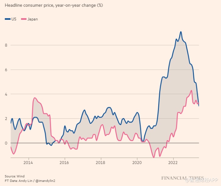 上周五公布的数据显示,受到水电费上涨的影响,6月的消费者价格指数和核心消费者价格指数(排除新鲜食品)年增长率从5月的3.2%上升到3.3%。相对于此,美国的通胀率为3%,而美联储已经将其基准利率从2022年初的近乎零提高到5%至5.25%。这是自2015年10月以来,日本的通胀率首次超过了美国。