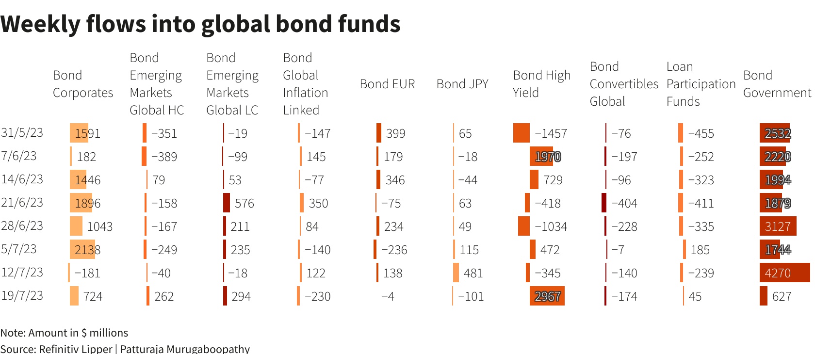 与此同时,在截至7月19日的一周里,全球债券基金净流入52.9亿美元,资金流入规模已连续第四周扩大。全球高收益债券基金净流入29.7亿美元,为4月5日当周以来最高;政府债券和公司债券基金的净流入金额分别为6.27亿美元和7.24亿美元。