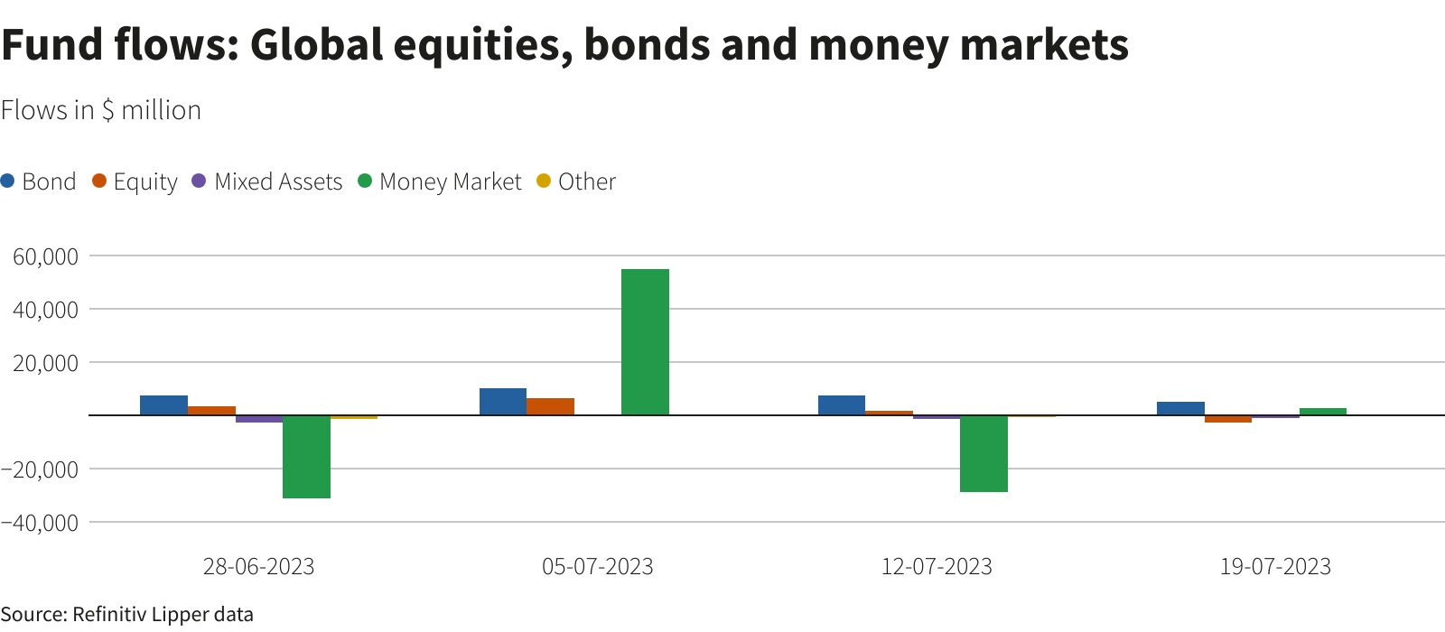 Lipper的数据显示,在截至7月19日的一周里,全球股票基金净流出26.7亿美元,为四周以来首次出现当周资金净流出,反映出投资者对全球经济增长放缓的担忧、以及在美联储下周政策会议前的谨慎态度。