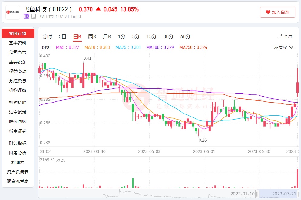 毫无疑问,这则拨开亏损迷雾的业绩预告也极大地提振了飞鱼科技的股价。翌日(7月21日),该股价高开高走,盘中一度涨逾20%,截止收盘其股价大涨13.85%,报于0.37港元,总市值为6.42亿港元。