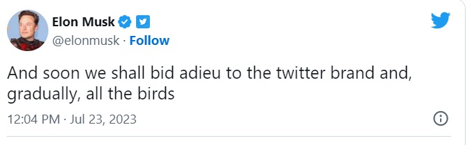 “很快,我们将告别推特的这一品牌,并逐渐告别所有的鸟类,”他在推文中表示。他还补充表示:“如果今晚找到了不错的‘X标志’,明天就会让它在全球上线。”