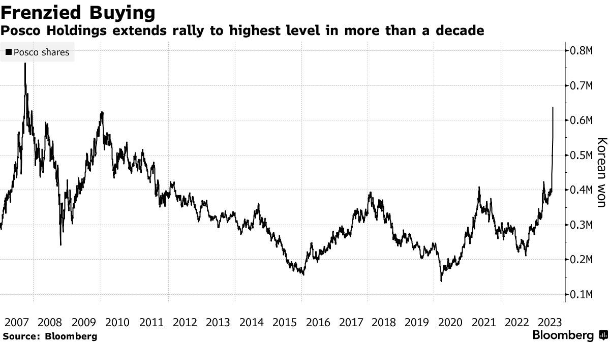 散户投资者近日一直在推动韩国最大规模的钢铁制造商浦项钢铁股价上涨,该公司今年这时间一直在电池材料领域押下重注,大举收购与电动汽车供应链相关的公司。