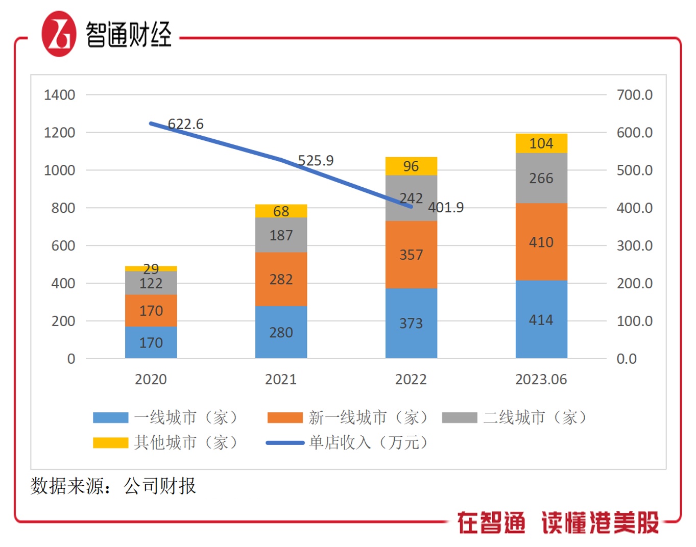 2018年,该公司门店突破100家,次年达到327家,2020-2022年平均每年增加247家,截至今年上半年,合共有1194家,较2022年末新增126家,如若按计划开600家,预计下半年需开474家,按往年直营店200多家算,新设的加盟店估计要达到300多家。在策略上,一线及新一线城市占比69%。