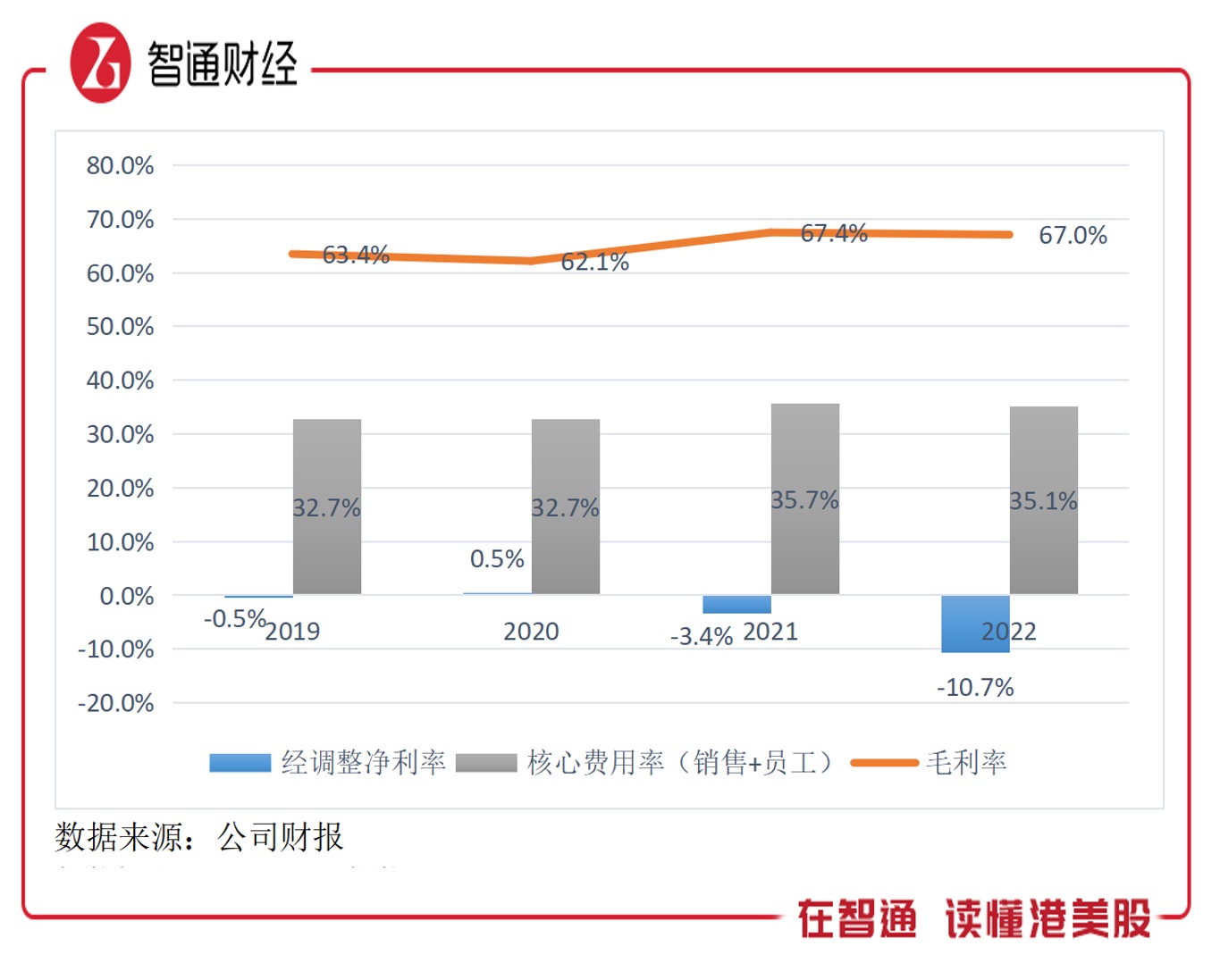 按照披露的经调整净利率看,主要拨回了上市开支及价值变动部分,2020年有微利,但之后亏损率扩张,2022年为10.7%。可见,该公司可调整折旧摊销调节盈利水平,加盟模式下人工成本将大幅下降,也有望提升盈利能力。