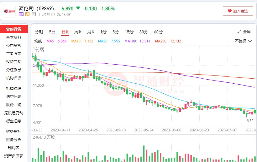 二级市场方面,今年以来,海伦司的股价腰斩,自1月9日创出17.30港元的阶段性高点以来,持续走低,截至7月24日收盘,股价期间累计跌幅达60%。
