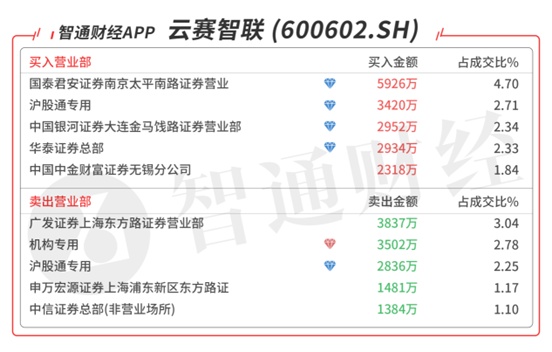 云赛智联(600602.SH):龙虎榜阵容豪华,机构与游资出现分歧,机构席位卖出3502万元,沪股通对倒买入584万元,买一是顶级游资作手新一的席位买入5926万元,买三是知名游资的席位买入2952万元,当日买入4510万元,该股突破所有均线,量能需持续放大。