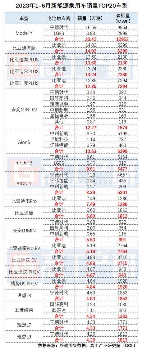 智通财经APP获悉,GGII依据终端零售数据统计显示,2023年上半年国内新能源汽车销量约为303.0万辆,同比增长38%。其中,新能源乘用车销售约291.4万辆,同比增长39%。销量排名前二十车型合计171.3万辆,占整个新能源乘用车销量的59%。