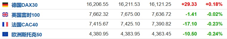 2.截至发稿,德国DAX指数涨0.18%,英国富时100指数跌0.02%,法国CAC40指数跌0.23%,欧洲斯托克50指数跌0.24%。