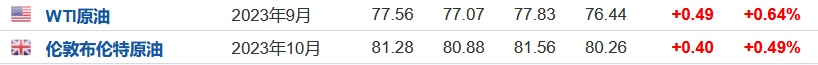 3. 截至发稿,WTI原油涨0.64%,报77.56美元/桶。布伦特原油涨0.49%,报81.28美元/桶。