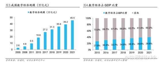 不仅如此,根据中国信通院的白皮书,2021年我国数字经济产业规模达到45.5万亿,同比增长16.2%,高于名义GDP增速3.4个百分点。数字经济GDP的比重达到39.80%,较“十三五”初期提升了9.6个百分点。数字经济已经成为我国发展新的增长动能。
