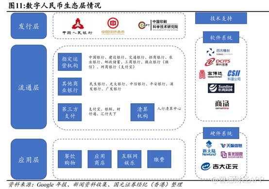 从产业链生态图谱来看,数字人民币发行层包括央行等机构;流通层包括指定机构、第三方支付机构及清算机构等;应用层包括餐饮购物、互联网娱乐、应用商店等。另外技术支持包括软件系统(如蚂蚁集团、商汤科技)和硬件系统(如紫光国微,天喻信息)。