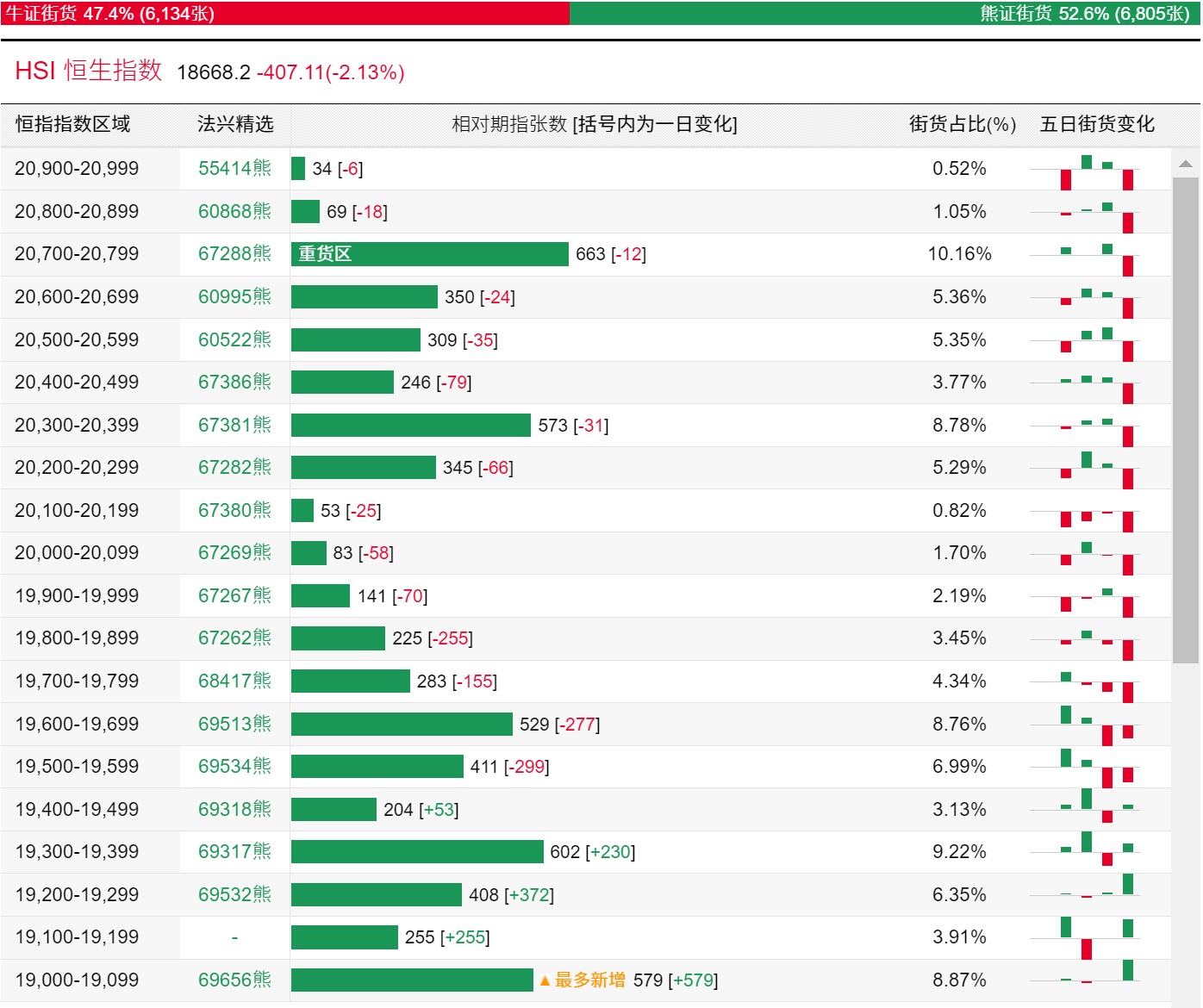 法兴恒指牛熊证街货分布图中的数据显示,熊证街货重货区在20700-20799区间,该区间最新熊证数量为663张,较上一交易日减少12张;最多新增在19000-19099区间,该区间最新熊证数量为579张,较上一交易日增加579张。