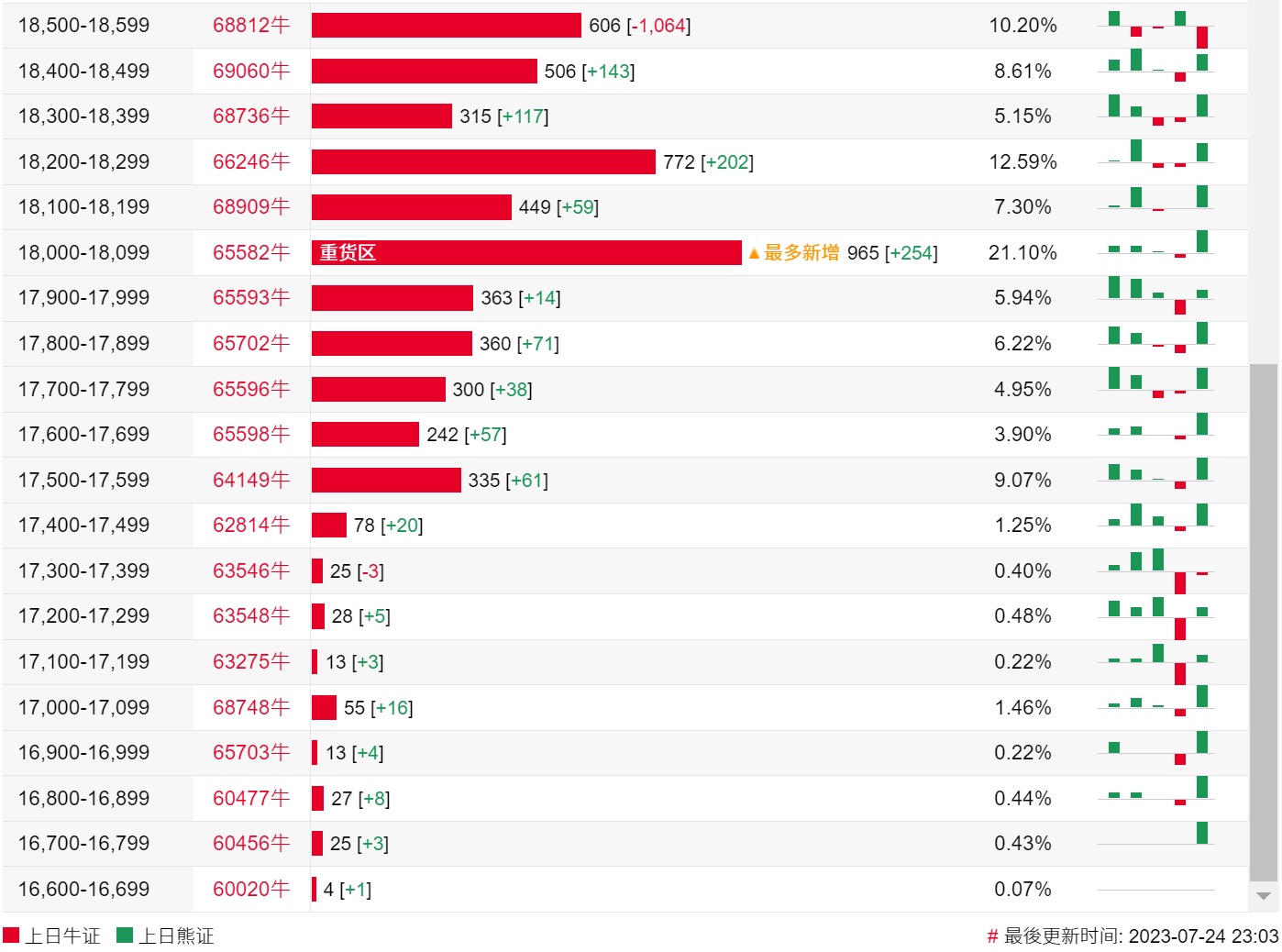 牛证街货重货区在18000-18099区间,该区间最新牛证数量为965张,较上一交易日增加254张;最多新增在同一区间。