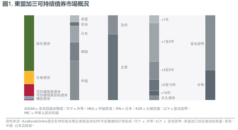 东盟加三的可持续债券市场由绿色债券主导,平均加权期限为4.5年。超过50%的未赎回债券由私营部门发行,意味着公营部门有更大的发债空间。为了促进新加坡的减碳措施并深化其绿色金融市场,政府宣布公营部门将在2030年前发行高达350亿新加坡元的绿色债券。