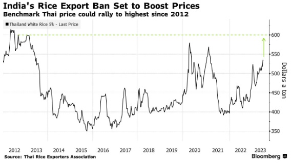 大米对亚洲和非洲数十亿人的饮食至关重要,价格飙升将增加通胀压力,并增加买家的进口账单。印度的限制措施适用于非巴斯马蒂白米的出口,目的是控制国内价格。此限制出台之际,人们越来越担心厄尔尼诺天气模式对农业供应的影响、欧洲气温飙升以及俄罗斯对乌克兰出口设施的袭击。