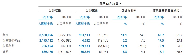 拆分收入结构来看,金马能源的收入来源于焦炭、衍生性化学品、能源产品以及贸易四项业务。根据公司的2022年报,焦炭业务是金马能源的第一大业务,收入占比约为68.7%;同期,公司的衍生品化学品、能源产品以及贸易业务收入占比分别为17.5%、5.9%、7.1%。