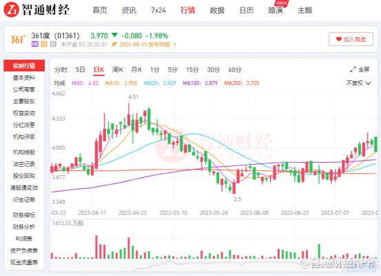 受益于线下客流与居民消费意愿的逐步回升,2023年上半年国产体育品牌业绩正呈现出回暖态势。自6月初起,361度(01361)港股股价自3.5港元的低点反弹,截至7月24日最新股价为3.97港元,反弹幅度超过10%。