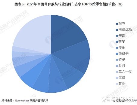 从市场竞争格局来看,中国运动服饰市场参与者众多,行业集中度相对较低。根据Euromonitor的数据,2021年,耐克以19.1%的市占率排名中国体育服装行业第一,阿迪达斯以14.6%的市占率位列第二,成为市占率超过10%的唯二品牌。