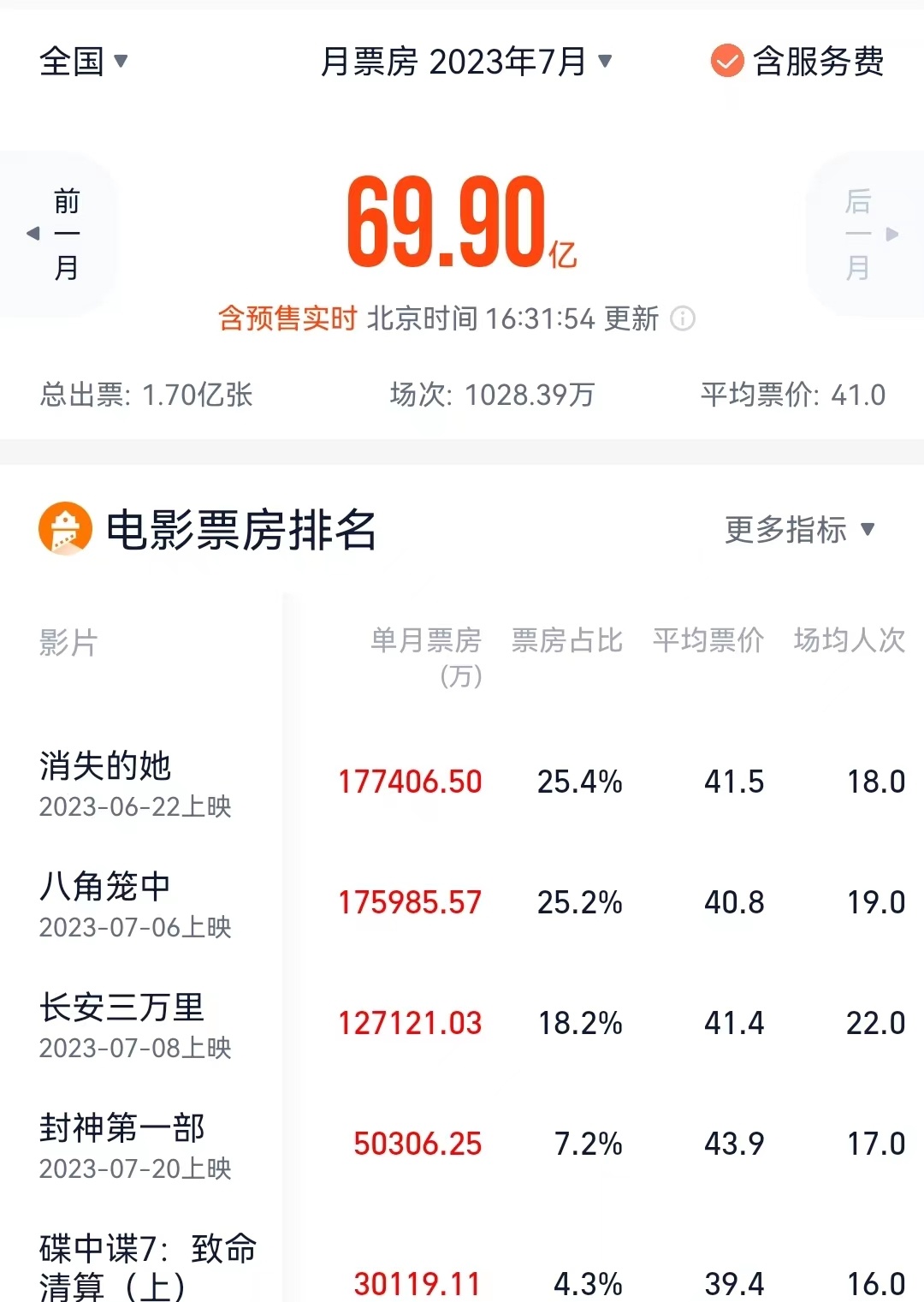 智通财经APP获悉,据灯塔专业版最新数据,截至7月25日16时31分,2023年7月总票房(含预售)突破69.90亿,超2018年7月总票房69.66亿成绩,刷新中国影史7月票房纪录。7月票房TOP5分别为《消失的她》、《八角笼中》、《长安三万里》、《封神第一部》、《碟中谍7:致命清算(上)》。