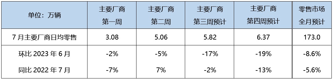 主要厂商零售7月第一周日均3.08万,环比6月初-2%,第二周日均5.06万,环比6月第二周-5%。第三周日均零售预计为5.82万,随着6月中旬厂商促销活动的开启,基数提升,环比6月第三周-17%。第四周车市热度与正常淡季季节性表现一致,日均零售预计为6.37万,环比6月第四周-19%。