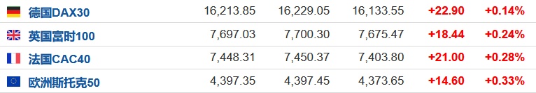 2.截至发稿,德国DAX指数涨0.14%,英国富时100指数涨0.24%,法国CAC40指数涨0.28%,欧洲斯托克50指数涨0.33%。
