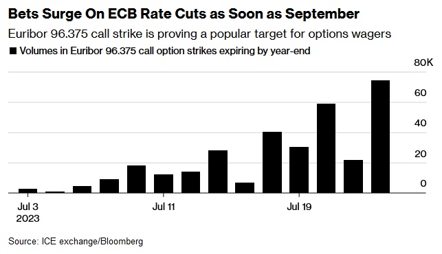 智通财经APP获悉,期权市场的交易员押注,欧元区经济的脆弱性将迫使欧洲央行以最快速度调整货币政策。货币市场定价显示,欧洲央行预计还将加息两次,在欧洲央行于本周加息25个基点(存款机制利率升至3.75%)之后,存款机制利率可能会进一步升至创纪录的4%。不过,期权市场显示,交易员押注欧洲央行在7月之后不会再次加息,并最早可能在9月降息,以避免对经济增长造成过于严重的打击。