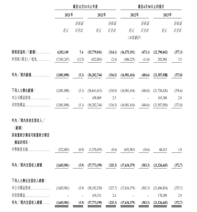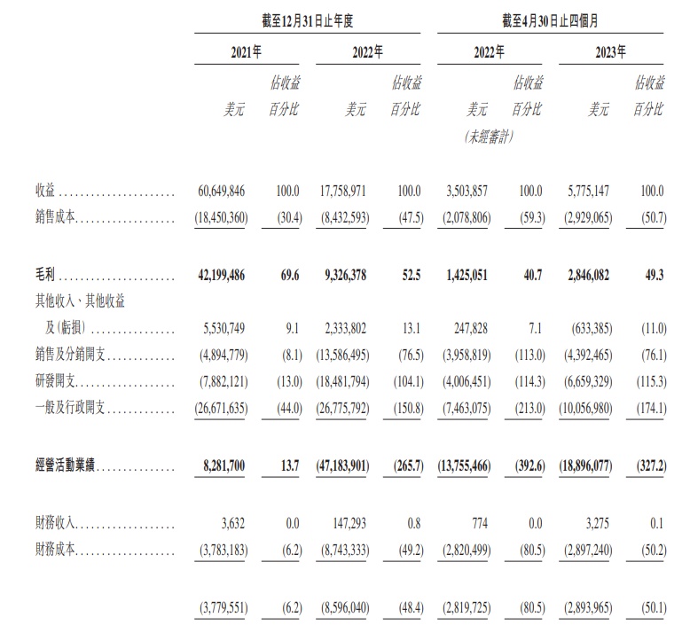 财务方面,截至2021年、2022年12月31日止年度以及截至2023年4月30日止四个月,觅瑞集团实现收益分别为美元约6064.98万元、1775.90万元、577.51万元。需要注意的是,该公司2021年、2022年以及2023年前四个月都在亏损,分别亏损美元约308.11万元、5620.27万元、2158.71万元。
